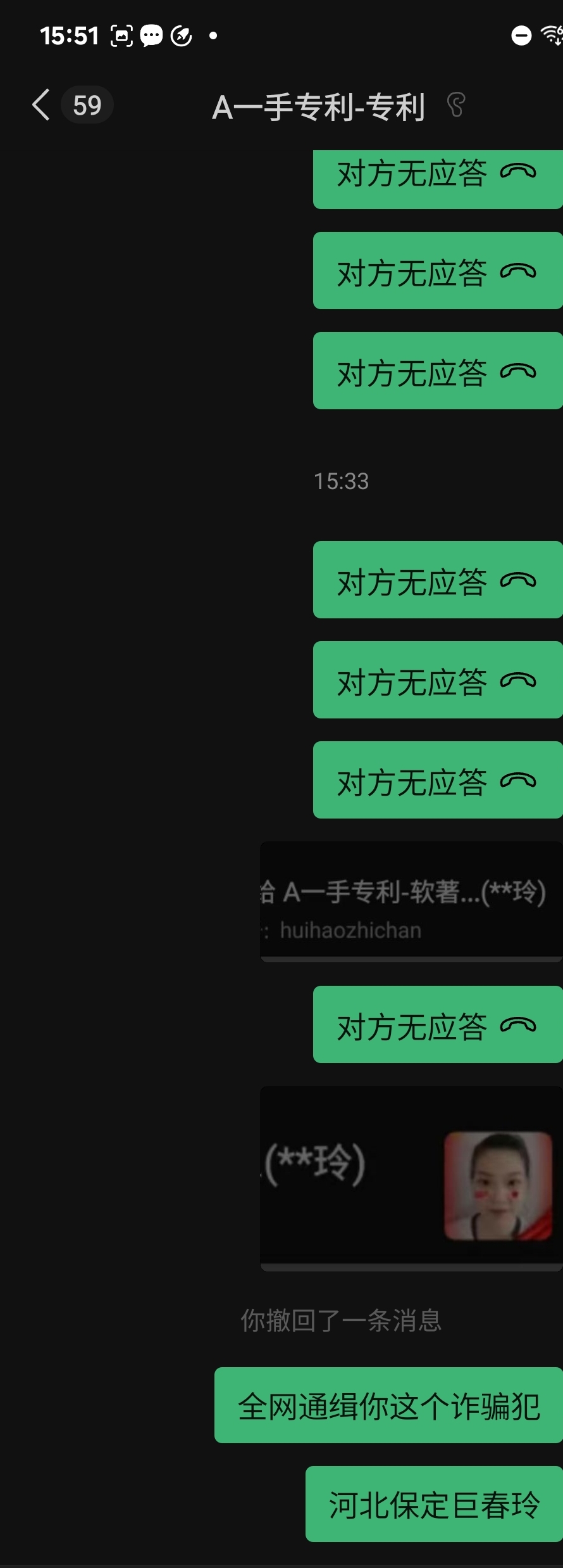 【保定慧昊知识产权服务有限公司】,专利约定好的非正常退款,现在直接不退了,公司已经注销了,随时可能跑路。老板电话也不接,法人翟一红,电话15933566282 。 对接业务员微信号ZHUANLI19803126401 ,QQ 3008325